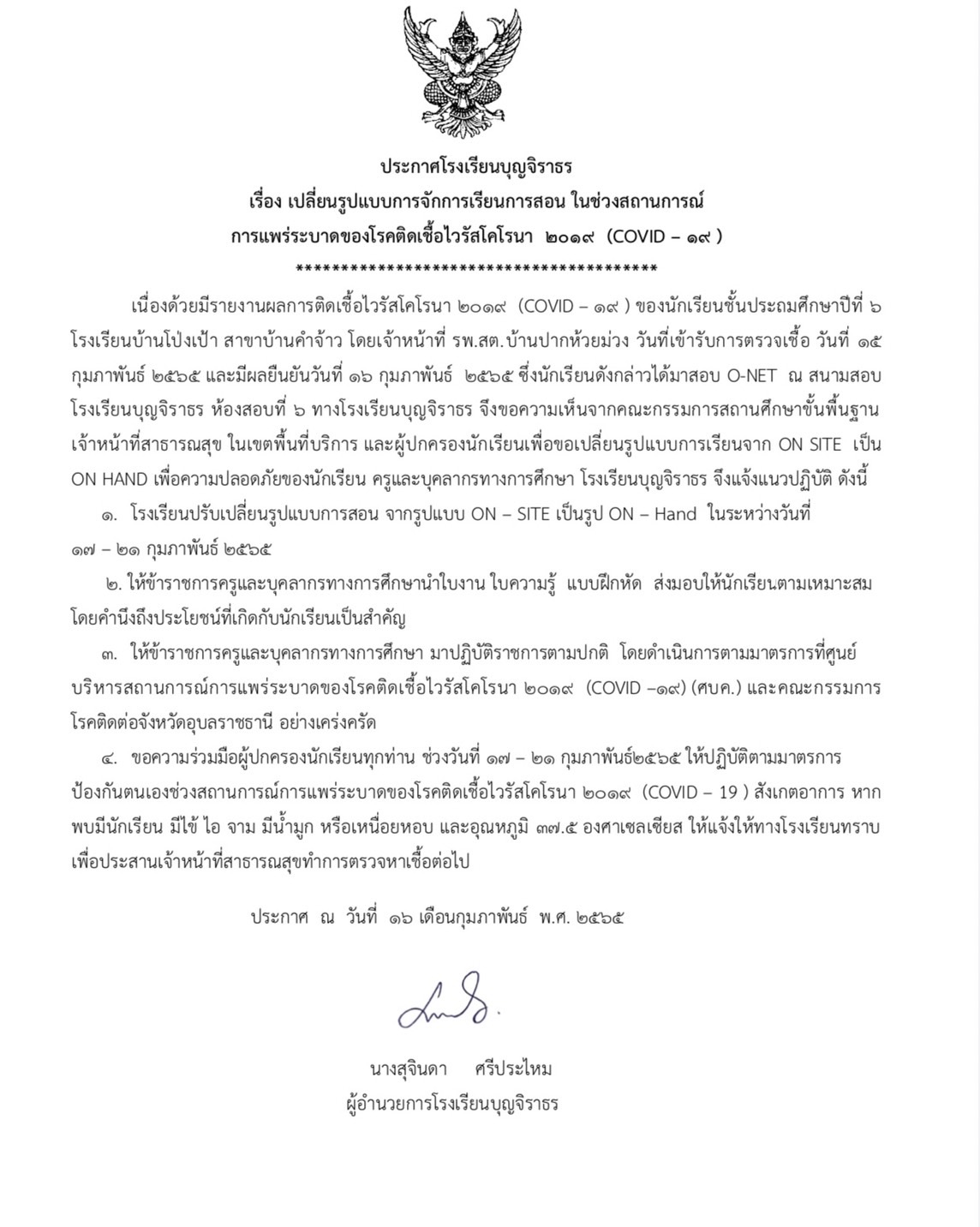 จัดรูปแบบการเรียนการสอน on -hand โรงเรียนบุญจิราธร